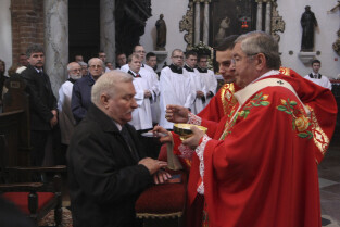 Gdańsk, Katedra Oliwska. Metropolita Gdański Arcybiskup Sławoj Leszek Głód - pierwsza rocznica ingresu. Nz. komunię otrzymuje Lech Wałęsa