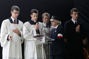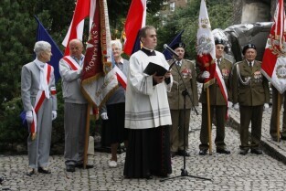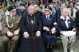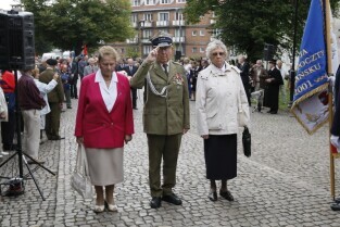 Gdańsk. Msza św. odprawiona przez Metropolitę Gdańskiego Abp Słowoja Leszka Głódzia oraz uroczystość składania kwiatów i wieńców pod Pomnikiem Obrońców Poczty Polskiej. Nz. od lewej: Metropolita Gdański Abp Słowoj Leszek Głódź, Prezes Okręgu Pomorskiego Związku Żołnierzy AK Teresa Urbanowa, Prezes Gdańskiej Rodziny Katyńskiej Emilia Maćkowiak