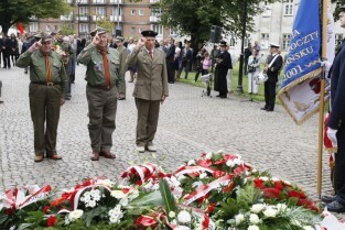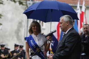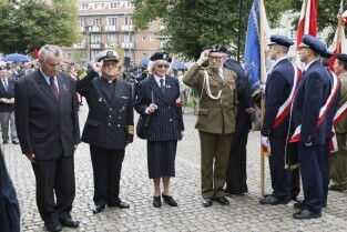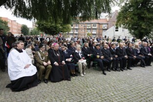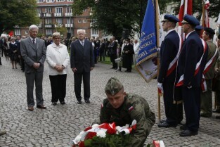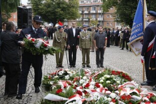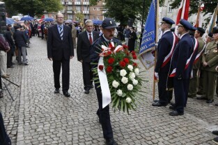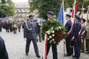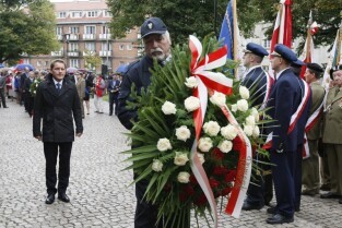 Gdańsk. Msza św. odprawiona przez Metropolitę Gdańskiego Abp Słowoja Leszka Głódzia oraz uroczystość składania kwiatów i wieńców pod Pomnikiem Obrońców Poczty Polskiej. Nz. W-ce Wojewoda Pomorski Michał Owczarczak
