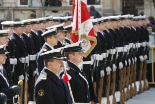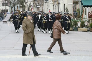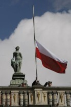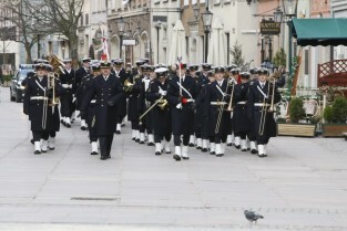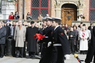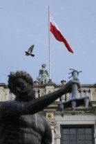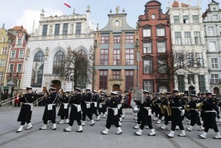 65 rocznica powrotu Gdańska do macierzy. Uroczystości na Długim Targu. Wciągniecie polskiej flagi na maszt na Dworze Artusa