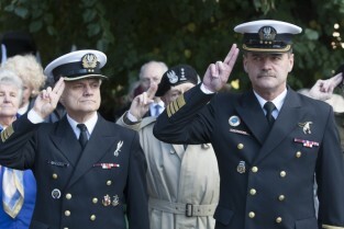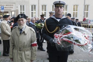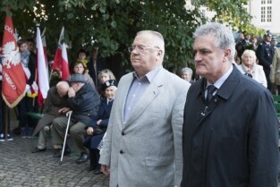 Gdańsk, Targ Rakowy. 74. rocznica utworzenia Polskiego Państwa Podziemnego i Szarych Szeregów. Nz. kwiaty składają Przewodniczący Rady Miasta Gdańska Bogdan Oleszek (po prawej) i Radny Miasta Gdańska Mirosław Zdanowicz
