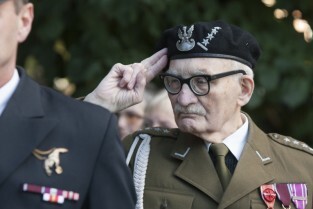 Gdańsk, Targ Rakowy. 74. rocznica utworzenia Polskiego Państwa Podziemnego i Szarych Szeregów. Nz. Prezes Okręgu Pomorskiego Światowego Związku Żołnierzy Armii Krajowej por. Jerzy Grzywacz