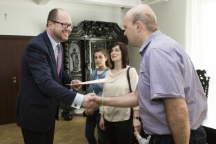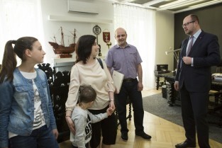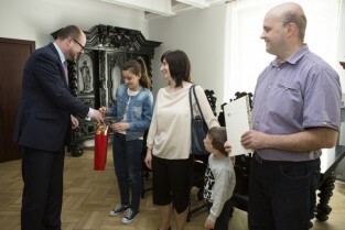 Urząd Miejski w Gdańsku. Prezydent Gdańska Paweł Adamowicz wręcza nagrodę w konkursie fotograficznym "Rodzina w Mieście", którą otrzymuje Marcin Radawiec z rodziną