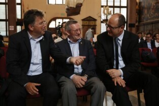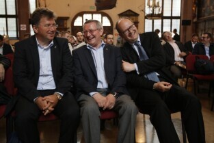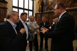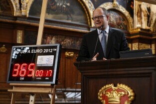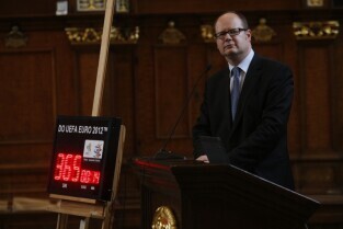 Delegacja, w składzie której znaleźli się sekretarz generalny UEFA David Taylor i dyrektor UEFA EURO 2012 Martin Kallen, a także kilkudziesięciu zagranicznych dziennikarzy odwiedziła Gdańsk na rok przed mistrzostwami EURO 2012. Gdańsk, Dwór Artusa.