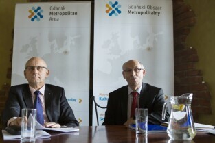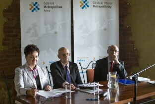 Konferencja prasowa Stowarzyszenia Gdański Obszar Metropolitalny poświęcona roli metropolii w perspektywie finansowej 2014-2020, w której udział wzięli Komisarz Unii Europejskiej ds. programowania finansowego i budżetu Janusz Lewandowski (P), Wiceprezes GOM Józef Reszke (L)oraz Burmistrz Kartuz Mirosława Lehman. Kartuzy, restauracja Złota Jesień przy ul. Polnej