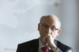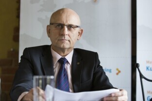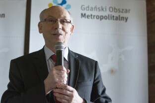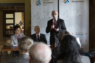Konferencja prasowa Stowarzyszenia Gdański Obszar Metropolitalny poświęcona roli metropolii w perspektywie finansowej 2014-2020, w której udział wzięli Komisarz Unii Europejskiej ds. programowania finansowego i budżetu Janusz Lewandowski, Wiceprezes GOM Józef Reszke (NZ) oraz Burmistrz Kartuz Mirosława Lehman. Kartuzy, restauracja Złota Jesień przy ul. Polnej