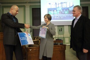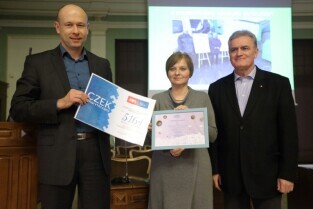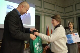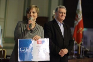 Gdańsk. Rozdanie nagród w "Sylwestrowym Konkursie Butelkowym". Konkurs zorganizowała Rada Miasta Gdańska i Zakład Utylizacyjny w Gdańsku. Nz. Wojciech Głuszczak, Prezes Zakładu Utylizacyjnego w Gdańsku, Małgorzata Bałkowska-Hospicjum dla Dzieci i Bogdan Oleszek-Przewodniczący Rady Miasta Gdańska.