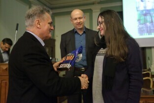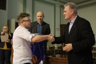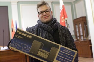 Gdańsk. Rozdanie nagród w "Sylwestrowym Konkursie Butelkowym". Konkurs zorganizowała Rada Miasta Gdańska i Zakład Utylizacyjny w Gdańsku. Nz. Zwycięzca konkursu Tomasz Rosiński.
