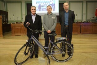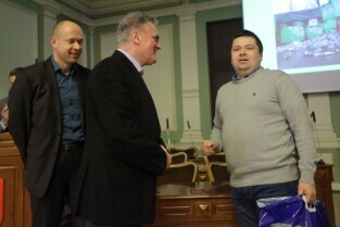 Gdańsk. Rozdanie nagród w "Sylwestrowym Konkursie Butelkowym". Konkurs zorganizowała Rada Miasta Gdańska i Zakład Utylizacyjny w Gdańsku. Nz. Wojciech Głuszczak, Prezes Zakładu Utylizacyjnego w Gdańsku, Zwycięzca konkursu Tomasz Rosiński i Bogdan Oleszek-Przewodniczący Rady Miasta Gdańska.