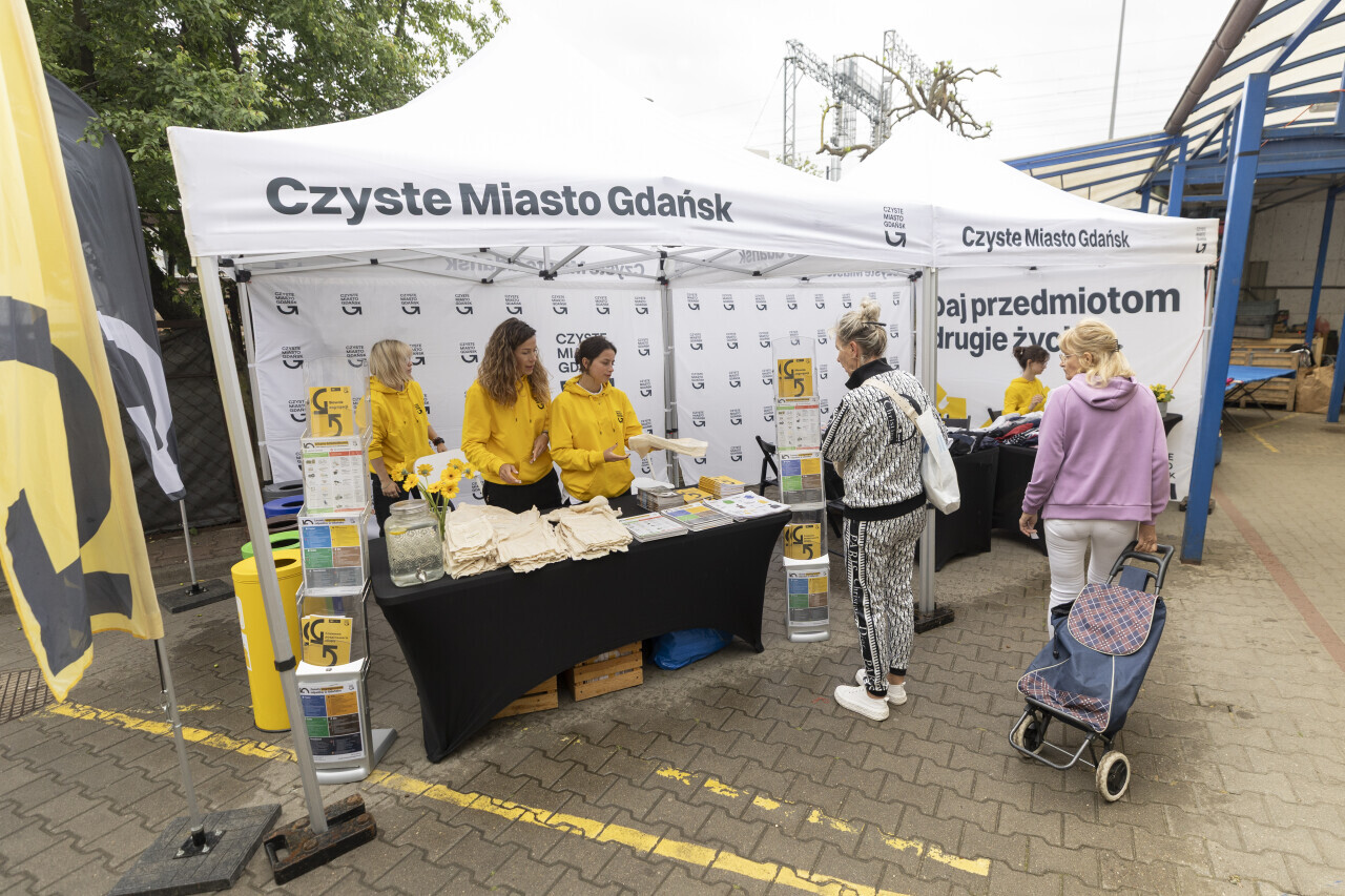 Rozdawanie woreczków wielokrotnego użytku na ryneczku we Wrzeszczu