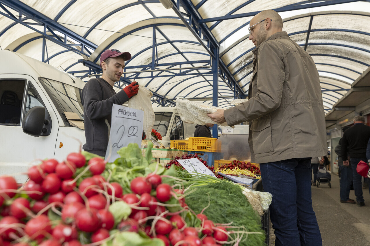 Rozdawanie woreczków wielokrotnego użytku na ryneczku we Wrzeszczu