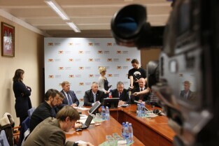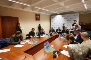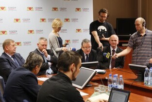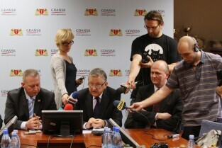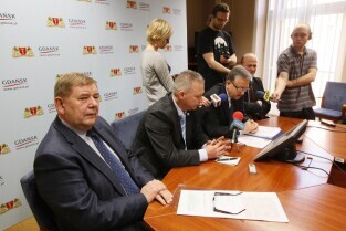 Gdańsk, Urząd Miejski. Konferencja prasowa podsumowująca prace komisji rozliczającej prace budowlane Hydorbudowy S.A. na PGE Arena Gdańsk. Nz. od lewej: Z-ca Prezydenta Gdańska Andrzej Bojanowski, Przewodniczący komisji rozjemczej Franciszek Rogowicz, W-ce Prezes Hydrobudowa S.A Andrzej Zwierzchowski