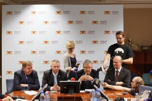Gdańsk, Urząd Miejski. Konferencja prasowa podsumowująca prace komisji rozliczającej prace budowlane Hydorbudowy S.A. na PGE Arena Gdańsk. Nz. od lewej: Przewodniczący komisji rozjemczej Franciszek Rogowicz, W-ce Prezes Hydrobudowa S.A Andrzej Zwierzchowski