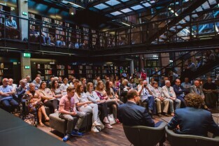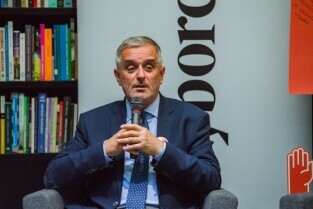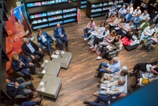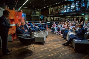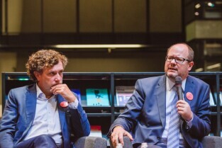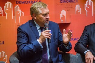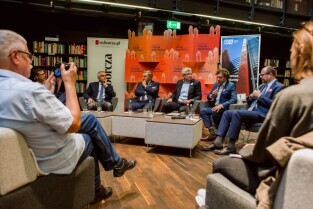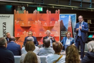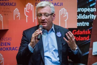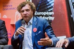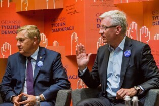 Europejskie Centrum Solidarności. Rozmowy o demokracji prezydentów miast w ramach Gdańskiego Tygodnia Demokracji. Nz. prezydent Wałbrzycha Roman Szełemej, Białegostoku Tadeusz Truskolaski, prezydent Poznania Jacek Jaśkowiak oraz prezydenci Sopotu Jacek Karnowski i Gdańska Paweł Adamowicz. Zgromadzona liczna publiczność oraz słuchacze.