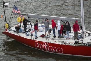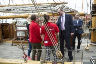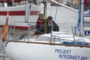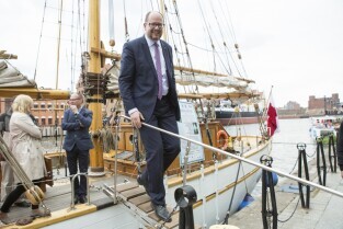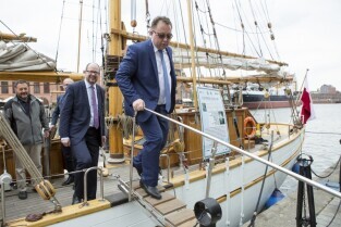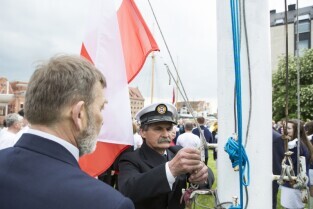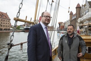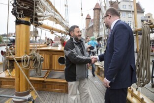 Gdańsk, Rybackie Pobrzeże. Rozpoczęcie Sezonu Żeglarskiego 2015 w ramach obchodzonego Święta Miasta. Nz. Prezydent Gdańska Paweł Adamowicz na jachcie STS Generał Zaruski