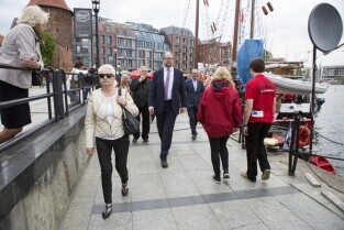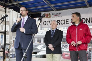 Gdańsk, Rybackie Pobrzeże. Rozpoczęcie Sezonu Żeglarskiego 2015 w ramach obchodzonego Święta Miasta. Nz. Prezydent Gdańska Paweł Adamowicz