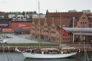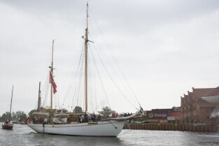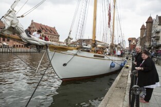 Gdańsk, Rybackie Pobrzeże. Rozpoczęcie Sezonu Żeglarskiego 2015 w ramach obchodzonego Święta Miasta. Parada jednostek pływających. Nz. jacht STS Generał Zaruski