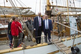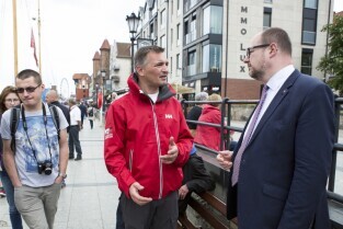 Gdańsk, Rybackie Pobrzeże. Rozpoczęcie Sezonu Żeglarskiego 2015 w ramach obchodzonego Święta Miasta. Nz. Prezydent Gdańska Paweł Adamowicz i Kapitan STS Generał Zaruski Jerzy Jaszczuk