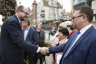Gdańsk, Rybackie Pobrzeże. Rozpoczęcie Sezonu Żeglarskiego 2015 w ramach obchodzonego Święta Miasta. Nz. Prezydent Gdańska Paweł Adamowicz i Dyrektor Biura Mera Miasta Omska Vitalii Samozvon