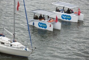 Gdańsk, Rybackie Pobrzeże. Rozpoczęcie Sezonu Żeglarskiego 2015 w ramach obchodzonego Święta Miasta. Parada jednostek pływających. Nz. napędzane energią słoneczną łódki H2O LIMO firmy Tesla