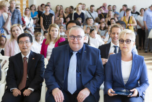 Gdańsk Przymorze. Rozpoczęcie roku szkolnego 2018/2019 w Szkole Podstawowej nr 76 oraz inauguracja zajęć w klasie z językiem chińskim. Nz. od lewej: Z-ca Prezydenta Gdańska Piotr Kowalczuk, konsul Chińskiej Republiki Ludowej Xu Jianguo, Dyrektor SP 76 Iwona Makurat