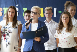 Gdańsk Przymorze. Rozpoczęcie roku szkolnego 2018/2019 w Szkole Podstawowej nr 76 oraz inauguracja zajęć w klasie z językiem chińskim. Nz. Dyrektor SP 76 Iwona Makurat
