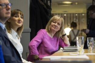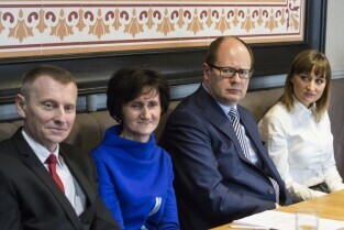 Konferencja prasowa poświęcona akcji "Rozsmakuj się w Metropolii. Weekend za pół ceny". Gdańsk, restauracja KOS przy ul. Piwnej. Nz. od lewej: Burmistrz Nowego Dworu Gdańskiego Jacek Michalski, Wójt Gminy Pszczółki Hanna Brejwo, Prezydent Gdańska Paweł Adamowicz, Natalia Daszewska (właścicielka "Fit&Florist")