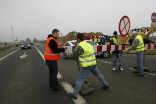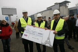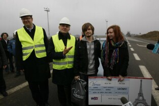 Rozpoczęcie budowy nowego terminala pasażerskiego na Gdansk Lech Walesa Airport oraz zamknięcie ul. Słowackiego przy lotnisku. Nz. Prezydent Gdańska Paweł Adamowicz (po lewej) i Prezydent Gdyni Wojciech Szczurek, którzy wręczają voucher na lot do Paryża ostatnim podróżnym, którzy jechali ul. Słowackiego w stronę Gdańska. Okazali się nimi dwoje młodych Gdynian wracających z Żukowa
