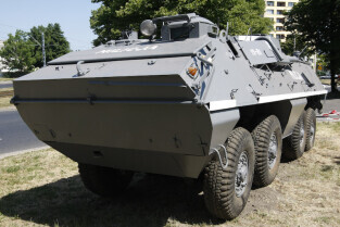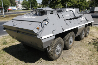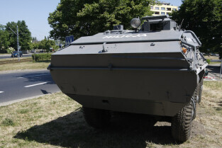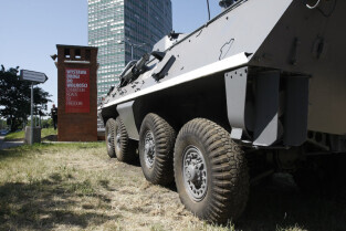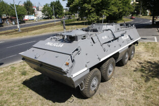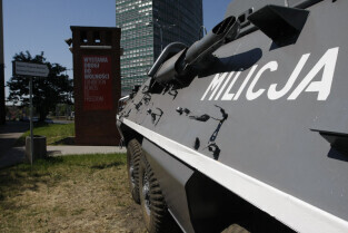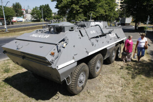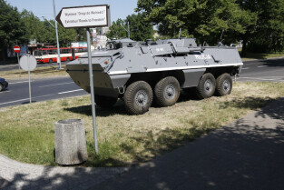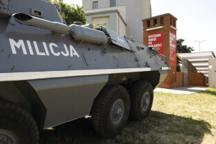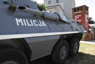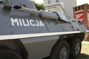Milicyjny transporter opancerzony SKOT przed wystawą Drogi do Wolności przy ul. Wały Piastowskie.
