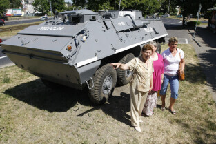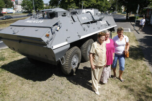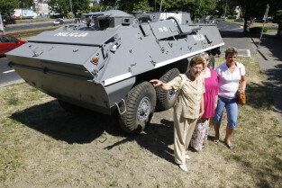 Milicyjny transporter opancerzony SKOT przed wystawą Drogi do Wolności przy ul. Wały Piastowskie. Nz. turyści fotografujący się przy pojeździe