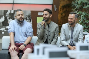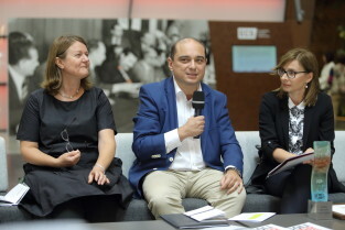 Gdańsk, ECS. Konferencja informacyjna dotycząca festiwalu SOLIDARITY OF ARTS. Nz. Patrycja Medowska-ECS, Basil Kerski-Dyrektor ECS i Barbara Frydrych-Dyrektor Biura Prezydenta Miasta ds. Kultury.