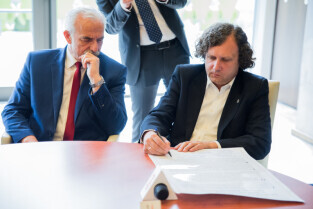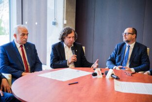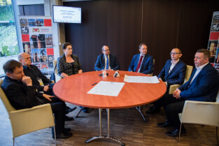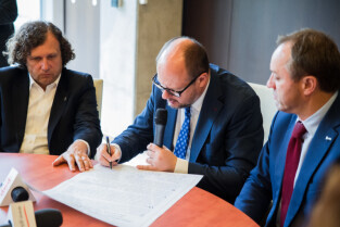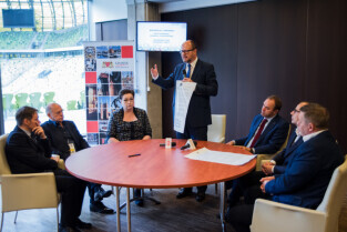 Gdańsk, Stadion Energa ul. Pokoleń Lechii Gdańsk. Samorządowcy największych miast Polski i Pomorza podpisali deklaracje w sprawie integracji. Nz. Od lewej: Mieczysław Struk - marszałek województwa pomorskiego, Marcin Wojdat - sekretarz m.st. Warszawy, Andrzej Lubiatowski - dyrektor biura Unii Metropolii Polskich, Anna Mackiewicz- zca prezydenta Bydgoszczy, Paweł Adamowicz - prezydent Gdańska, Zbigniew Nikitorowicz z-ca prezydenta Białegostoku, Jan Kleinszmidt - przewodniczący Sejmiku Województwa Pomorskiego