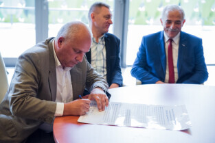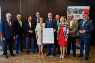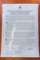 Gdańsk, Stadion Energa ul. Pokoleń Lechii Gdańsk. Samorządowcy największych miast Polski i Pomorza podpisali deklaracje w sprawie integracji. Nz. Sygnatariusze Deklaracji przyjazne i bezpieczne Pomorze (od l.): Andrzej Hrycyna przewodniczący Rady Powiatu Bytowskiego, Jacek Czapiewski - z-ca burmistrza Bytowa, Jacek Karnowski - prezydent Sopotu, Paweł Adamowicz - prezydent Gdańska, Janina Kwiecień starosta kartuski, marszałek woj. pomorskiego Mieczysław Struk, Jan Kleinszmidt przewodniczący Sejmiku, Województwa Pomorskiego, Sylwia Biankowska z-ca burmistrza Kartuz, Piotr Wittbrodt z-ca burmistrza Rumii, Paweł Orłowski wicemarszałek woj. pomorskiego