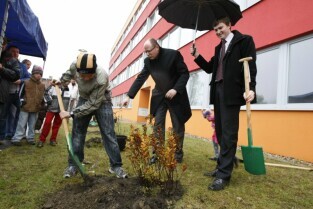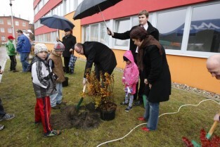 Impreza integracyjna lokatorów, którzy miesiąc temu zamieszkali w nowym budynku komunalnym na Oruni przy ul. Ubocze 24. Nz. Prezydent Gdańska Paweł Adamowicz sadzi drzewka przed budynkiem