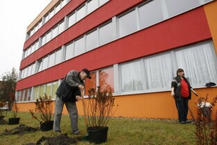 Impreza integracyjna lokatorów, którzy miesiąc temu zamieszkali w nowym budynku komunalnym na Oruni przy ul. Ubocze 24. Nz. sadzenie drzewek przed budynkiem