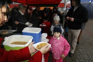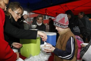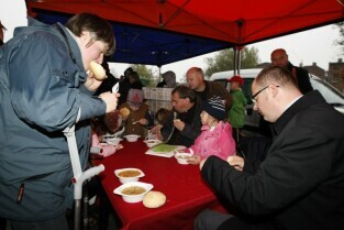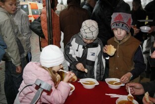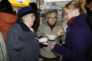 Impreza integracyjna lokatorów, którzy miesiąc temu zamieszkali w nowym budynku komunalnym na Oruni przy ul. Ubocze 24. Nz. "integracyjna grochówka"