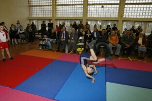 Impreza integracyjna lokatorów, którzy miesiąc temu zamieszkali w nowym budynku komunalnym na Oruni przy ul. Ubocze 24. Nz. pokaz drużyny zapaśników ze Szkoły Podstawowej nr 16