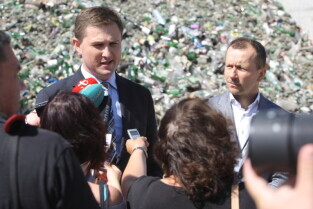 Gdańsk. Konferencja dotycząca segregacji szkła. Zastępca Prezydenta Gdańska, Piotr Grzelak podsumował efekty roku (od 1 lipca 2016 r.) obowiązkowej segregacji szkła. Nz. Wiceprezydent Gdańska Piotr Grzelak i Prezes ZU Michał Dzioba.