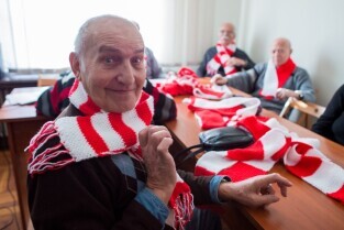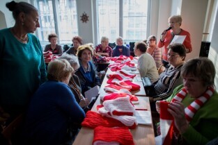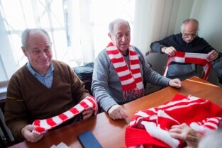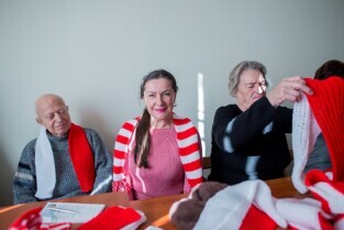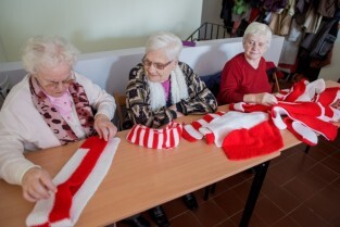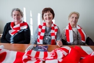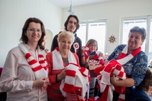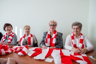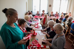 Seniorzy przekazują szaliki i kotyliony na Święto Niepodległości. Klub seniora Motława.