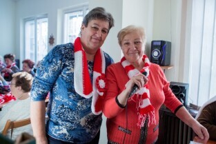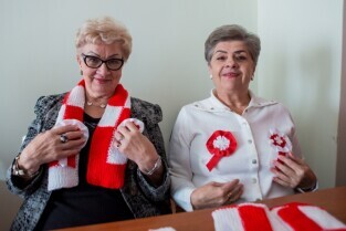 seniorzy przekazują szaliki i kotyliony na Święto Niepodległości. Klub seniora Motława. Nz od lewej Pani Bogna Filipowicz ze stowarzyszenia SUM i Helena Turk, szefowa klubu seniora.