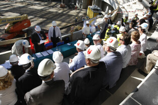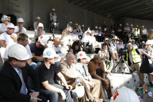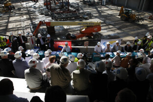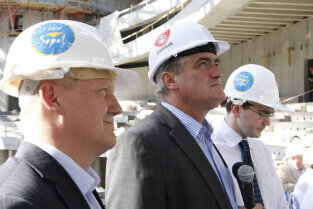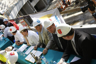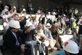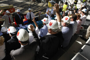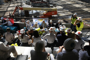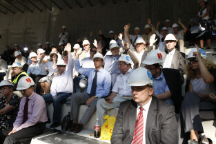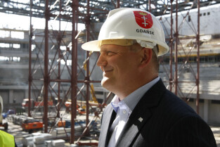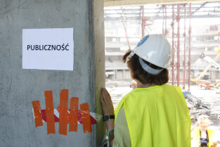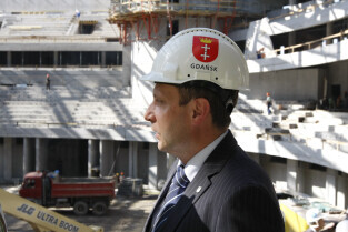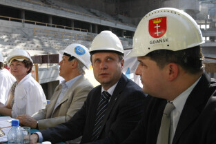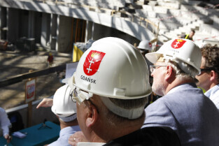 Niecodzienne obrady rad miejskich: Gdańska i Sopotu, na budowanej Hali Widowiskowo-Sportowej. Radni przegłosowali uchwały upoważniające ich przewodniczących do wezwania Rady Ministrów do anulowania błędnej decyzji odrzucającej zmianę granic tych dwóch miast. Nz. gdańscy radni.