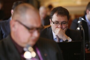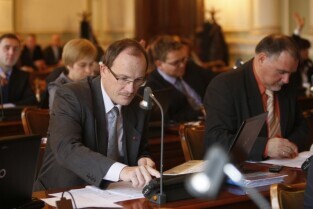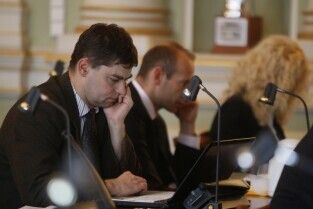 Październikowa sesja Rady Miasta Gdańska w Nowym Ratuszu. Nz. radny Lech Kaźmierczyk, po lewej radny Wojciech Błaszkowski