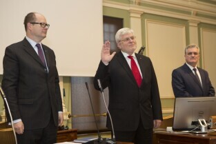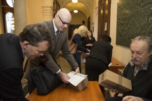 Gdańsk, Nowy Ratusz. Sesja Rady Miasta Gdańska. Nz. zaprzysiężenie na Marka Bumblisa na Radnego Miasta Gdańska; po lewej Prezydent Gdańska Paweł Adamowicz, po prawej Przewodniczący Rady Miasta Gdańska Bogdan Oleszek