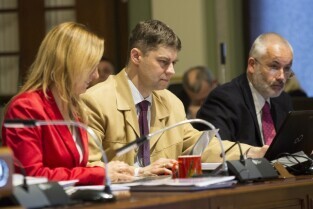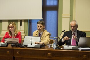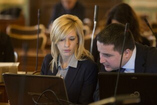 Gdańsk, Nowy Ratusz. Sesja Rady Miasta Gdańska. Nz. Wiceprzewodniczący Rady: Agnieszka Owczarczak, Wojciech Błaszkowski, Piotr Czauderna
