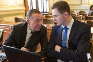 Gdańsk, Nowy Ratusz. Sesja Rady Miasta Gdańska. Nz. Radny Piotr Gierszewski i Z-ca Prezydenta Gdańska Piotr Kowalczuk