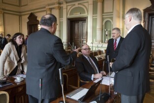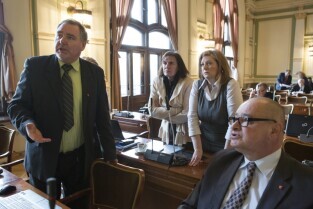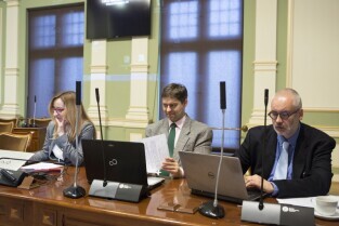 Sesja Rady Miasta Gdańska w Nowym Ratuszu. Nz. od lewej radni: Piotr Gierszewski, Anna Maria Kołakowska, Anna Wirska, Grzegorz Strzelczyk