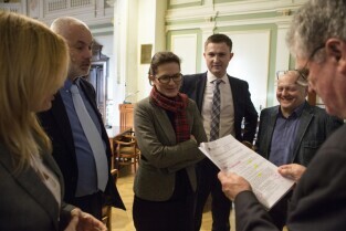 Sesja Rady Miasta Gdańska w Nowym Ratuszu. Nz. od lewej: radni Agnieszka Owczarczak, Piotr Czauderna, Aleksandra Dulkiewicz, Z-cy Prezydenta Piotr Grzelak i Wiesław Bielawski, Przewodniczący Rady Miasta Gdańska Bogdan Oleszek