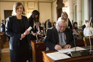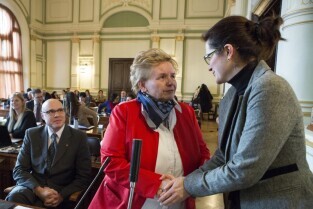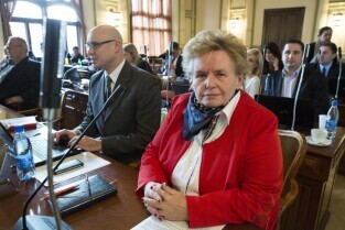 Sesja Rady Miasta Gdańska w Nowym Ratuszu. Nz. nowo zaprzysiężona radna Teresa Wasilewska, po prawej radna Aleksandra Dulkiewicz