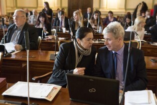 Sesja Rady Miasta Gdańska w Nowym Ratuszu. Nz. radni Małgorzata Chmiel i Andrzej Kowalczys