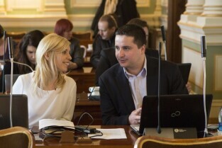 Sesja Rady Miasta Gdańska w Nowym Ratuszu. Nz. radni Emilia Lodzińska i Przemysław Ryś